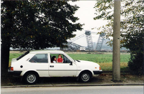 Fortuna nach Abbruch. Vor dem abgebrochenen Haus Bethlehemer Straße 152, Nahaufnahme mit Blick auf´s Kraftwerk Fortuna mit Schaufelradbagger dazwischen. Auto direkt vor Haus 152 im Auto sitzend Elfie und Sven Dörr. |