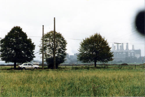 Fortuna nach Abbruch. Vor dem abgebrochenen Haus Bethlehemer Straße, Blick auf´s Kraftwerk Fortuna mit Schaufelradbagger dazwischen.Auto direkt vor Haus 152 |