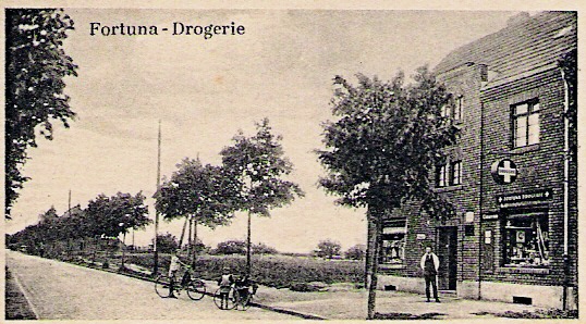 AK mit Fotoansichten der Kirche, Fortuna-Werke und der Drogerie mit Metzgerei Krawinkel mit 3 Personen, Kirche |